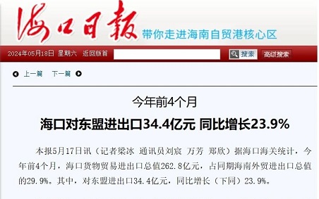 近日,??谌請笤凇敖衲昵?個月,海口對東盟進出口34.4億元,同比增長23.9%”的新聞報道中,對普利制藥在??谶M出...