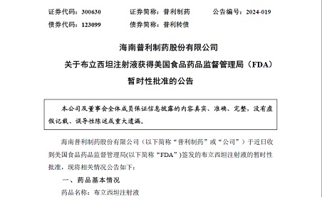 海南普利制藥股份有限公司(以下簡稱“普利制藥”或“公司”)于近日收到美國食品藥品...