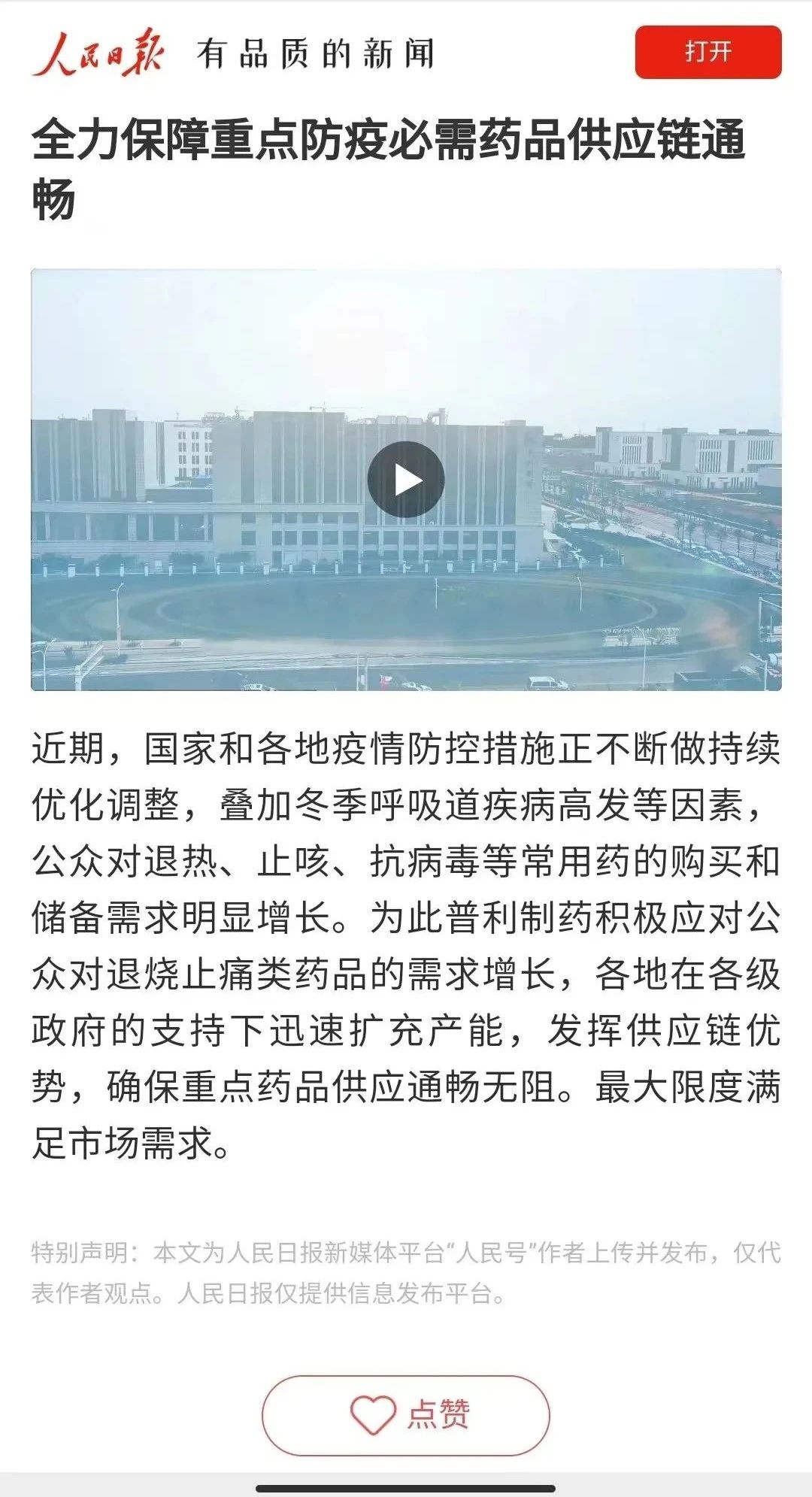 人民日報為普利制藥點贊!