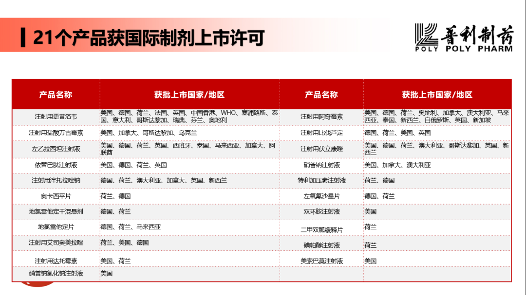 普利制藥1992年成立于??冢侵袊t(yī)藥制劑國際化先導(dǎo)企業(yè)和國家工信部智能制造示范企業(yè);自2005年以來,普利制藥不斷深化藥品國際化開拓,共有21款制劑和13款原料藥產(chǎn)品獲得國際上市。