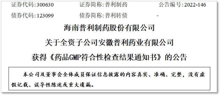 海南普利制藥股份有限公司(以下簡稱“公司”)全資子公司安徽普利藥業(yè)有限公司(以下簡稱“安徽普利”)于近日收到安徽省藥品審評查驗中心頒發(fā)的《藥品GMP符合性檢查結(jié)果通知書》,所涉產(chǎn)品為:原料藥(氫氧化鎂)。