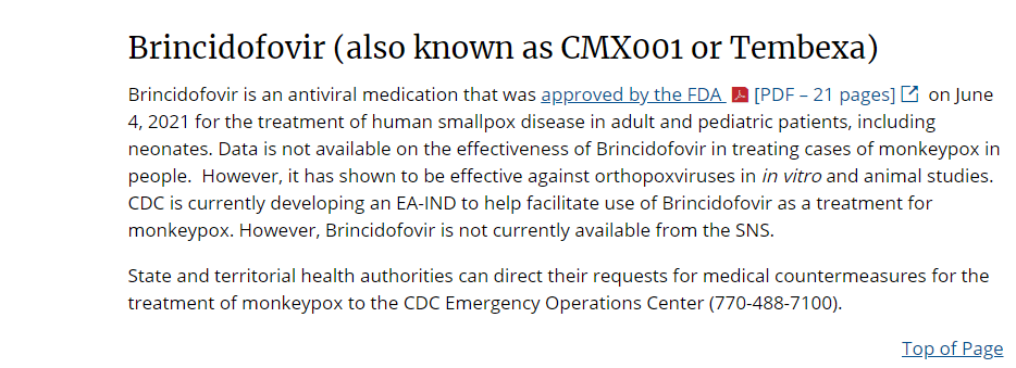 目前,美國疾病控制與預(yù)防中心(CDC)正在制定一份擴展使用在研新藥方案(EA-IND),以推動布林西多福韋用于猴痘患者的治療。