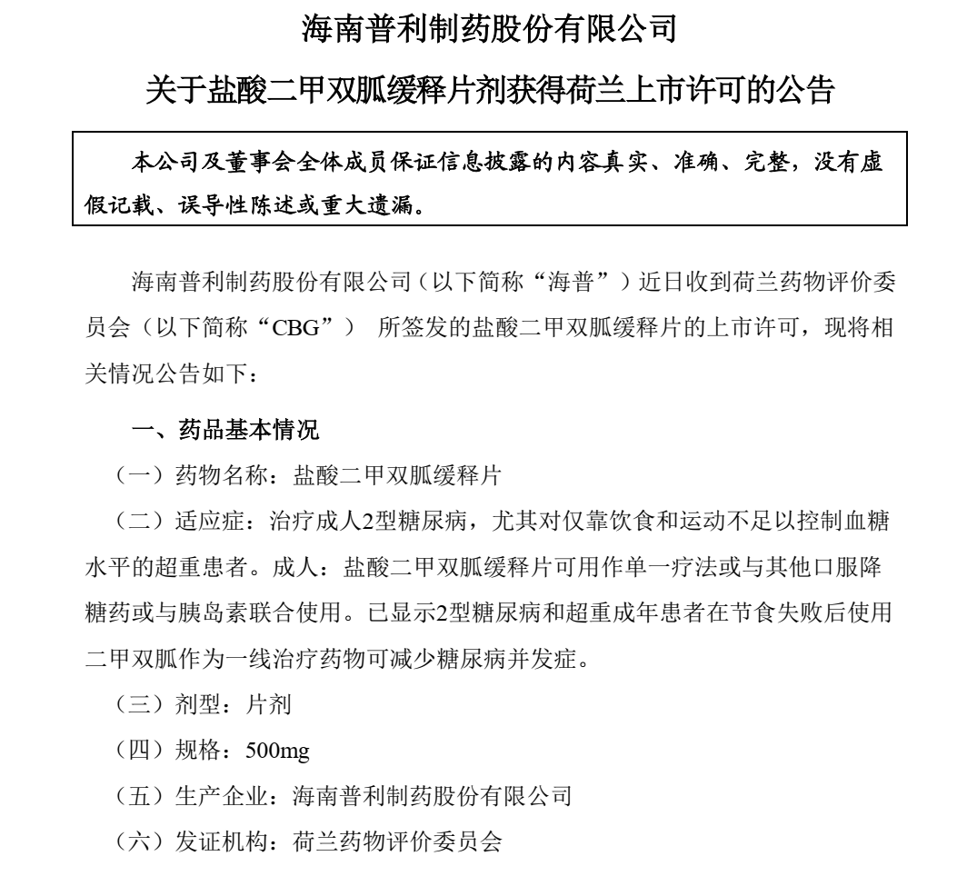 海南普利制藥股份有限公司近日收到荷蘭藥物評價委員會(CBG)所簽發(fā)的鹽酸二甲雙胍緩釋片的上市許可,標志著普利制藥具備了出口并在荷蘭銷售鹽酸二甲雙胍緩釋片的資格,也標志著唐必呋不止是普通的二甲雙胍,而是具有出口品質(zhì)的二甲雙胍,其質(zhì)量、療效、安全性獲得國內(nèi)外廣泛認可。